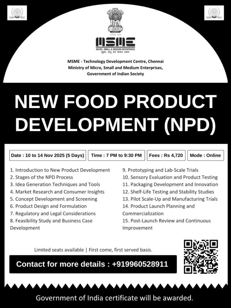 5 Days Online training program on New Food Product Development by MSME-Technology Development Center, Chennai.